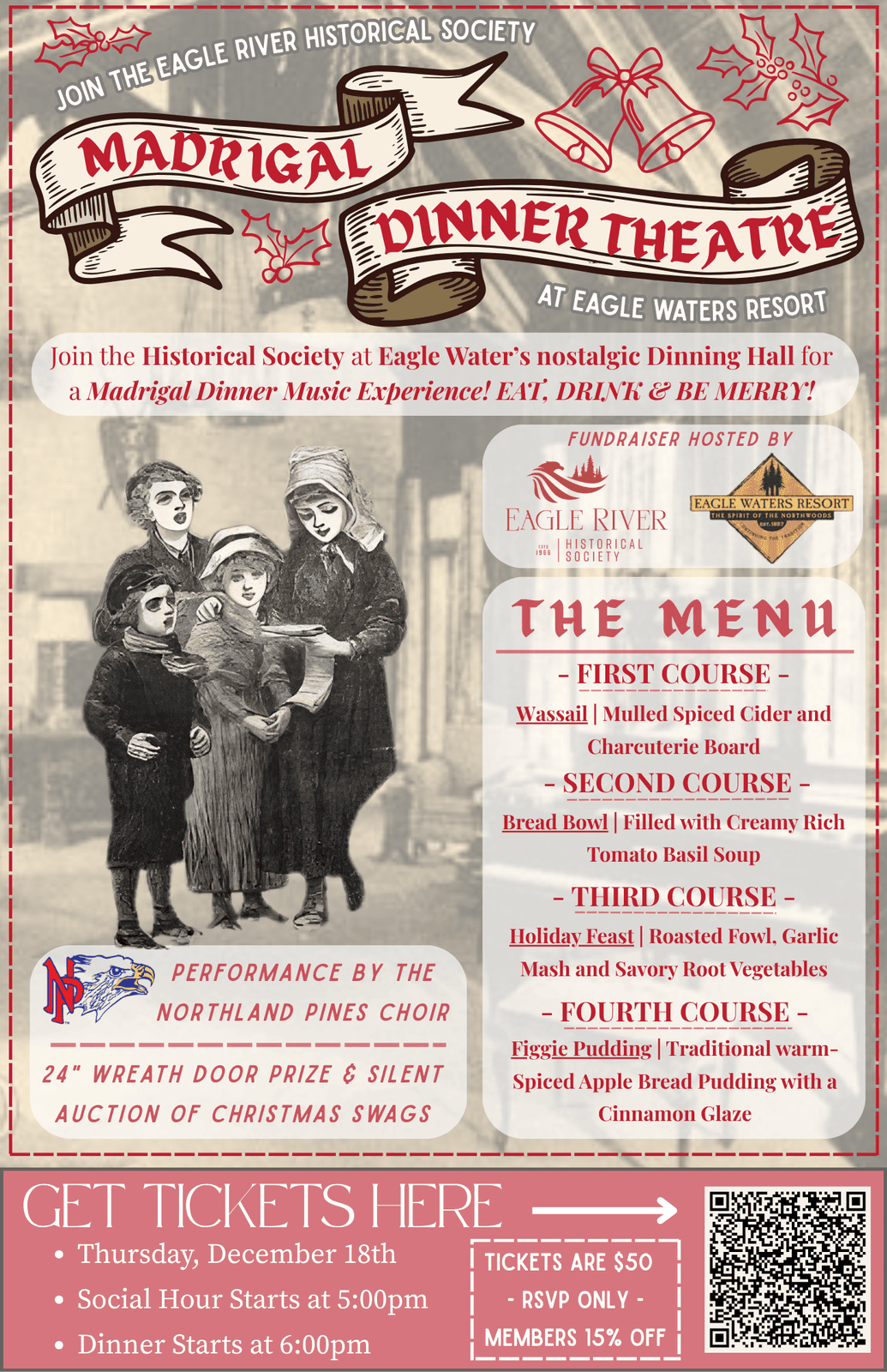 Join the Eagle River Historical Society at Eagle Water's Resort & Supper Club for a Madrigal Dinner Theatre Experience! Enjoy a Four Course dinner, Door Prize, & Silent Auction! Performance is by the Northland Pines Choir!